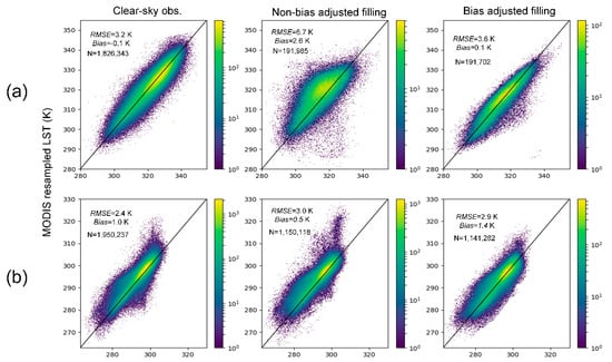 Comparison of Aqua MODIS and Meteosat SEVIRI-derived land surface temperatures (LSTs). (a) day-time data and (b) night-time data. MODIS data includes both the clear-sky MODIS LSTs from MYD11A and that output from Step 1 and Step 2 of the cloud gap-filling methodology detailed in Section 3. Colour bars indicate the number of co-located observations within the plotting space.