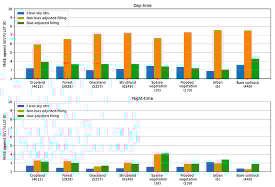 RMSE of MODISClear, MODISSTDF, and MODISPMBC against SEVIRI LST for different land cover types in the day (top) and in the night (bottom). Numbers in the brackets denote pixel numbers of that specific land cover type.