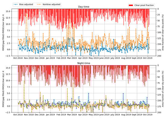 The daily time series of difference between RMSE for gap-filled LST (MODISSTDF and MODISPMBC) and RMSE for clear sky LST (MODISClear) are demonstrated in Figure 10. The fraction of clear sky LST pixels over the study area for each day are also shown using the red bar on the right-hand y-axis. From the contrast between blue (MODISPMBC) and orange (MODISSTDF) lines, we can see that the relative performance between the bias adjusted gap-filling algorithm against the non-bias adjusted algorithm is stable over different seasons of the year. The performances of the non-bias adjusted vs. bias adjusted algorithms are not significantly influenced by the fraction of clear sky LST pixels that are needed to build the gap-filling model.
