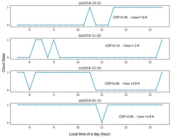 Time series of cloud state reported using the in situ data record from the upward pointing LWIR radiometer installed at the ILRI Kapiti Research Station between 7:30 a.m.–1:30 p.m. for the four dates selected and reported in Figure 6, (a) 22 October 2018; (b) 2 November 2018; (c) 19 December 2018; and (d) 15 January 2019. A value of 1 = stable cloud was present for at least the prior 15 min, whilst a value of 0 = stable cloud was not present for the 25 min prior to the LST derivation. Cloud duration fraction (CDF) and Δbias values are reported for each sub-Figure and defined at the start of Section 4.4.