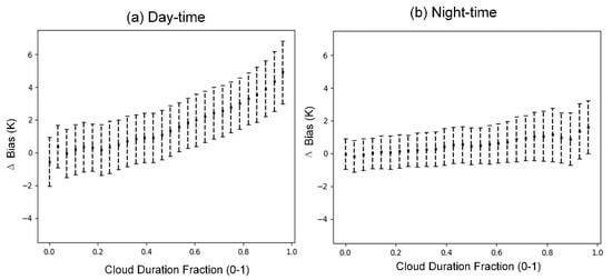 The outcome (Figure 12) is that in the daytime, the mean Δbias rises as the CDF increases from 0 to 1, while the standard deviations are close for all CDF-based groups. This phenomenon, together with the results in Figure 11, indicate that better day-time performance of our bias adjustment strategy is achieved under conditions of higher CDF ranges in the morning, especially when CDF exceeds 0.5. Essentially, longer periods of cloud cover prior to the afternoon Aqua MODIS overpass tend to provide improved performance of the bias adjustment approach. This is logical because, up to a certain limit, the longer a pixel is covered by cloud, the longer it is shadowed from direct sunlight and therefore the larger the temperature difference will be relative to clear-sky conditions. By contrast, at night there is only a very slight increase in Δbias with increasing CDF, probably indicating that the change in LST is more influenced by the presence/absence of solar radiation in the day time rather than by the presence/absence of downwelling atmospheric radiation from cloud layers at night.