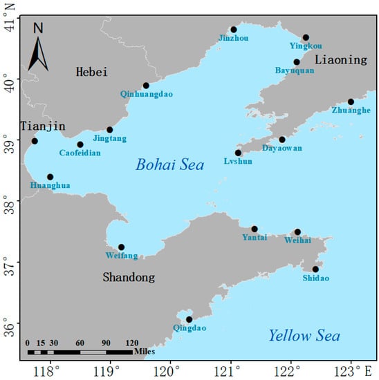 The study area in this paper includes Bohai Sea and its surrounding waters in China. As shown in Figure 1, the study area ranges from 117° E to 123° E, 35.5° N to 41° N. This region includes the main ports in five provinces around the Bohai Economic Rim, including Qingdao Port, Yantai Port, Dalian Port, Tianjin Port, Yingkou Port, etc. The study area is the main area of maritime trade in northern China, and also an important navigable area in China. The study area is adjacent to North Korea, South Korea, Japan, and other countries in eastern Asia. The navigable environment of Bohai Sea is relatively complex, and the average water depth of the sea area is less than 30 m [24]. Influenced by monsoons, the climate of Bohai Sea and Yellow Sea presents obvious seasonal and spatial characteristics. In winter, influenced by cold air, the wind is strong, and the waves and surges produced have a great influence on the navigability of ships [25]. In summer, as warm and humid air flows northward, sea fog is easily generated and has a great influence on ship navigability [26].