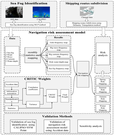 In order to evaluate the navigation risk in Bohai Sea and its surrounding waters, first, a sample database based on AHI data and CALIPSO vertical feature mask (CALIPSO-VFM) data is established, and a sea fog identification method based on Multilayer Perceptron (MLP) method is developed. Second, the method is used to obtain a large historical sea fog data set of the study area, which is combined with other evaluation factors to calculate the occurrence frequency of severe sea conditions. Then, the criteria importance through intercriteria correlation (CRITIC) objective weighting method is used to determine the weights of the evaluation criteria, and obtain navigation risk maps of the area via global information system (GIS) mapping technology. In order to further analyze the risks, the Delaunay triangulation method is used to divide the sea area into different waterway regions, and the risk values for the specific waterway areas are calculated. Finally, two validation methods are used to validate the sea fog identification method and navigation risk estimation model, and a sensitivity analysis of the model is carried out. A method flow chart of this process is shown in Figure 2.
