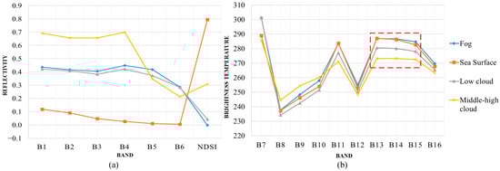 After obtaining the spectral features of each object, it is necessary to analyze the spectra to select features with better classification effect. The visible band of the Advanced Himawari Imager sensor onboard Himawari-8 consists of channels 1–3 (central wavelengths of 0.47 μm, 0.51 μm, and 0.64 μm, respectively); channels 4–6 are near-infrared bands (central wavelengths of 0.86 μm, 1.6 μm, and 2.3 μm, respectively), and channels 7–16 are infrared and far-infrared bands (central wavelengths of 3.9 μm, 6.2 μm, 6.9 μm, 7.3 μm, 8.6 μm, 9.6 μm, 10.4 μm, 11.2 μm, 12.4 μm, and 13.3 μm, respectively). The visible and near-infrared spectral characteristic curves of different objects are shown in Figure 5a. In the first three bands, the mid-high level clouds and the sea surface are significantly different from the sea fog and low clouds, but it is difficult to distinguish between low clouds and sea fog. With an increase of wavelength, the reflectance of all kinds of features gradually decrease, but the rate of change of sea fog in band 5 is significantly slower than that of other features, and the difference between the sea fog and the low clouds becomes obvious. According to [34], there are a large number of water droplets of 1 μm diameter in sea fog, which increase the reflectance measured in bands 4 and 5 and slow down the rate of change of reflectance in band 5; such behavior provides an obvious means to distinguish sea fog from other objects.