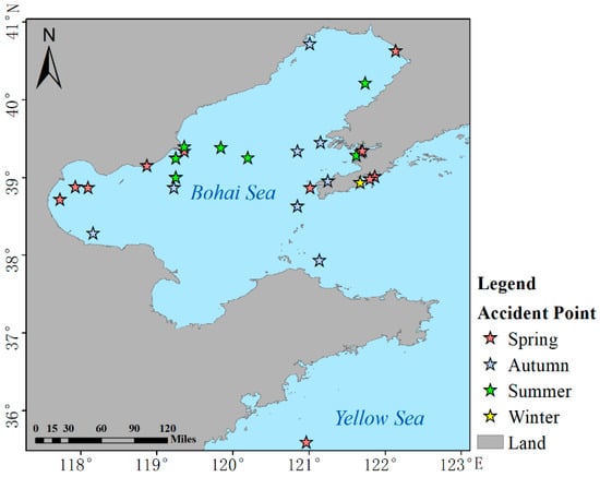 The identification of relevant criteria is a very critical step in the construction of an assessment model. The navigation risks mentioned in this paper refer to the loss of people or property and the possible impact of the navigation environment, which may consist of harsh conditions, resulting in the improper operation of the ship in the course of navigation, and which may cause ship collisions (i.e., the collision of two or more ships), collisions with stationary objects (i.e., with a reef, coast, or building), grounding (where the bottom of the ship touches the bottom of the sea due to insufficient water depth), or a sunken ship (sinking of ship) [38]. In order to obtain the criteria that may lead to identifying navigation risks more objectively, we use accident data from Maritime Safety Administration of the People’s Republic of China in study areas to determine criteria that have a greater impact on ship navigation. In this paper, environmental risks are mainly used for assessment, so the accidents caused by purely human factors need to be eliminated. After screening, a total of 39 accident records were included. The distribution of accident data is shown in Figure 6, where different color points represent accidents in different seasons.