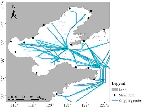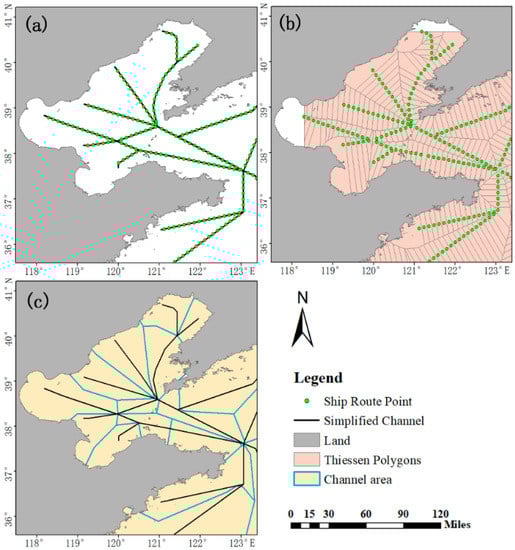 To provide a suitable risk analysis of specific shipping lanes in Bohai Sea and its surrounding waters, 107 main shipping routes officially recommended by the China Maritime Safety Administration in the study area [31] are considered in this paper (as shown in Figure 7). Next, the shipping routes are manually simplified (as shown in Figure 8a). Then, the Delaunay triangulation method is used to divide the navigation area into the main shipping routes. The main steps of this process are described as follows.