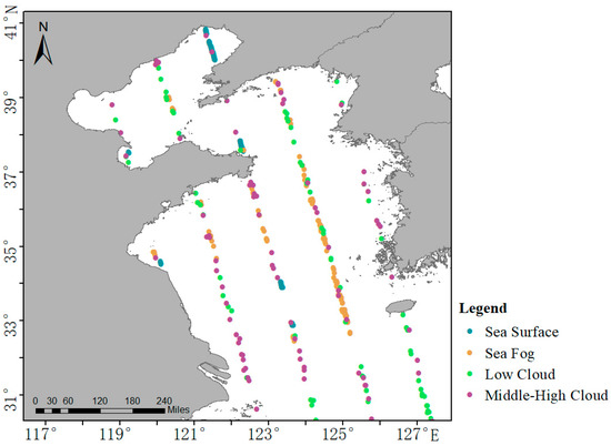 It is difficult to distinguish between sea fog and low clouds and stratus clouds through visual interpretations [32]. Therefore, a sea fog sample database is established using CALIPSO-VFM data to assist the selection of sea fog samples from AHI images [5,33]. Figure 4 shows the selection method, where Figure 4a is an AHI image on 15 June 2018 at 05:10 UTC, and Figure 4b is the classification result when using CALIPSO-VFM data from 15 June 2018 at 05:17 UTC. In the area in the red box in Figure 4b, the CALIPSO-VFM data are used to identify places where clouds are in contact with the sea surface, which are considered as sea fog points. From these, we extract the spectral values from the corresponding positions in the AHI images (e.g., the red dots in Figure 4a). Then, the spectral values at the sea surface, low clouds, and medium-high level clouds are obtained using the same approach. A total of 9141 samples of sea fog, 10,071 samples of the sea surface, 8733 samples of low clouds, and 10,771 samples of middle-high level clouds were selected and used in this paper.