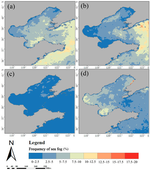 Frequency distribution of sea fog in (a) spring; (b) summer; (c) autumn; (d) winter.