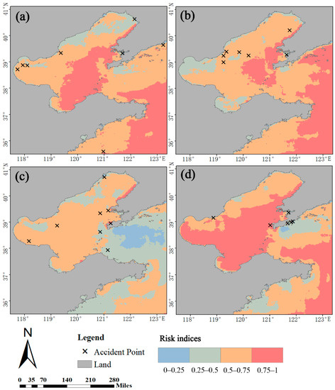 The navigation risk evaluation model was coded in the R language and ArcGIS software. The matching results between the evaluation results and accident points are shown in Figure 11a–d, the latter of which respectively shows the results from in spring, summer, autumn, and winter. The specific matching results are shown in Table 7.