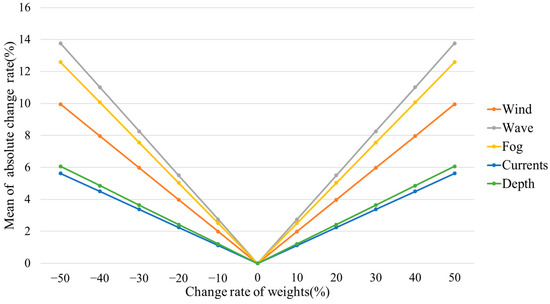 It can be seen from the results that the most sensitive criterion is waves, and the least sensitive criteria are currents. The descending order of sensitivity is waves, sea fog, wind, water depth, and currents. The maximum change rate is 14% when the change amplitudes of the criteria weights reach a maximum of 50%, and the corresponding change ratio is 0.28. The change rates of the evaluation results are much smaller than those of the criteria weights, which means the weights obtained by the CRITIC objective weight method are in good agreement with the criteria values, and the proposed navigation risk evaluation model has good stability.