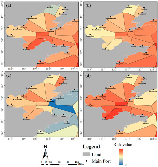 For further analysis, the evaluation results were calculated for every shipping region, as shown in Figure 13. In winter and spring, high-risk shipping regions are in the south, where the risks are high on the routes to Laizhou Port, Yantai Port, Harbor Port, Shidao Port, and Qingdao Port. In summer and autumn, high-risk shipping regions are in the north, and the risks are higher on the routes to Yinkou Port, Dalian Port, and Dandong Port. Other high-risk routes are from Qingdao Port to Yantai Port in spring and summer, and from Tianjin Port to Yantai Port and Shidao Port in spring and summer.