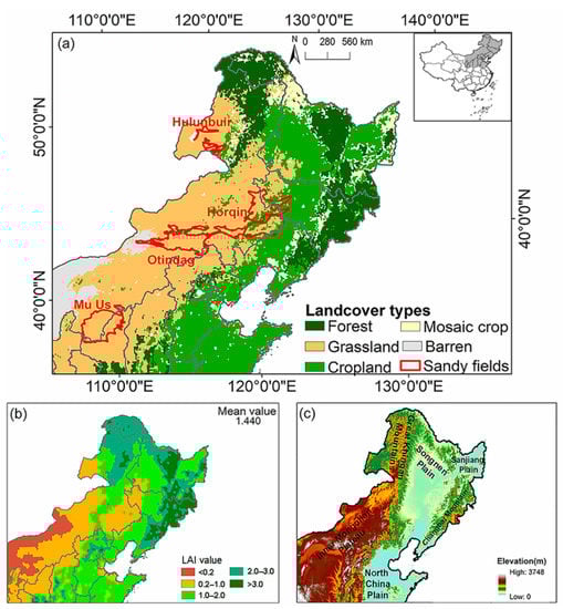 Study area land cover (a), the growing season mean (GSM) LAI from 1982 to 2013 (b), and the elevation (c) in Northeast China. The land cover data come from the MOD12Q1 provided by NASA Land Processes Distributed Active Archive Center (LP DAAC).