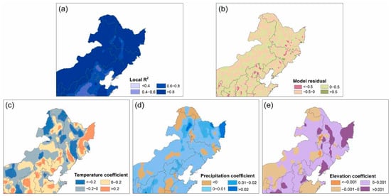 GWR model results: spatial distribution of local R2 value (a), model residual (b), and coefficients for temperature (c), precipitation (d) and elevation (e).