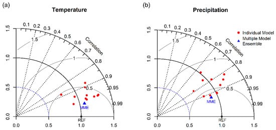 The Taylor diagram was used to examine the performance of CMIP6 climate models in simulating monthly mean temperature and precipitation. The Taylor diagram is a useful visual tool to summarize the degree of similarity between simulated and observed values of a climate field [,]. This diagram displays the centered root-mean-square difference (E), the correlation coefficient (r), and the ratio of standard deviations (σ) of a pair of simulated and observed values as a single point on a two-dimensional plot, so that different models can be compared and evaluated []. The multiple model ensemble (MME) mean is also calculated for all models. MME has been shown to outperform individual models and is also expected to provide more robust estimates of future changes [,].