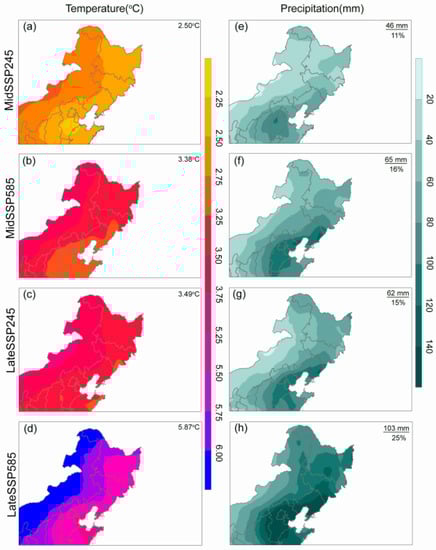 Projected regional mean GSM temperature and precipitation during the mid-century and late century under the SSP245 and SSP585 scenarios are summarized in Table 1 together with the baseline (1982–2013) values. The four different scenarios are labeled as MidSSP245, MidSSP585, LateSSP245, and LateSSP585, respectively. The ranges of values are also provided. Both the regional mean temperature and precipitation are expected to increase, and this increase is greater for the late century and higher emissions scenario. This is consistent with previous projection results based on CMIP5 GCMs [,]. For SSP245, the overall temperature for NE China is projected to increase by 2.50 (ranging from 2.20 to 2.86) °C in the mid-century and 3.49 (ranging from 3.19 to 3.87) °C in the late century. For SSP585, the overall temperature is projected to increase by 3.38 (ranging from 3.01 to 3.83) °C in the mid-century and 5.87 (ranging from 5.17 to 6.59) °C in the late century. For SSP245, regional mean precipitation is projected to increase by 46 (ranging from 13 to 102) mm in the mid-century and 62 (ranging from 17 to 124) mm in the late century. For SSP585, it is projected to increase by 65 (ranging from 16 to 125) mm in the mid-century and 103 (ranging from 37 to 192) mm in the late century. These values represent an 11% and 16% increase from 2041 to 2070 and a 15% and 25% increase from 2071 to 2100 under the emissions scenarios SSP245 and SSP585, respectively.