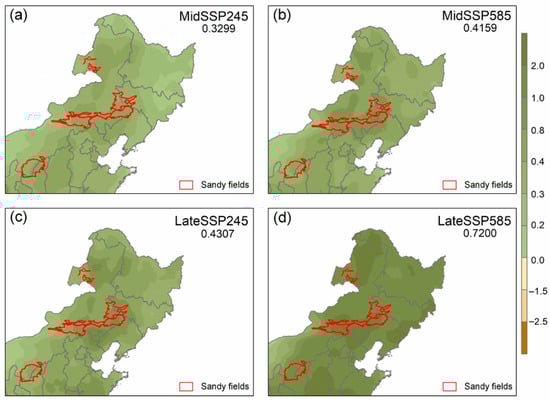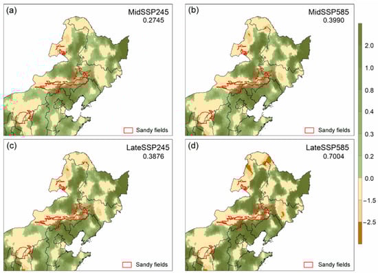 Future GSM LAI changes (a–d) relative to the historical period (1982–2013) for the mid-century (2041–2070) and late century (2071–2100) under the SSP245 and SSP585 emissions scenarios. Regional mean change values are presented in the upper right corner of each plot. Red line represents the boundaries of four major sandy fields in NE China.