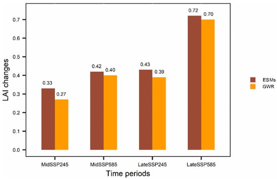 LAI change values predicted by CMIP6 ESMs (brown) and GWR models (yellow) in NE China. The numbers at the top of the bar represent the regional mean change value over NE China.