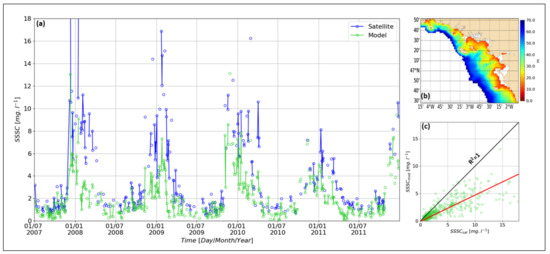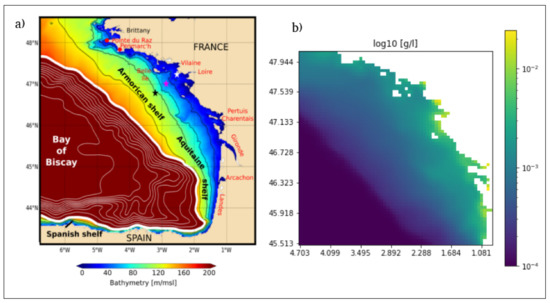- With in situ data (Reference [28], Section 4): In situ data were collected at one station of latitude 4715.592N and longitude 232.972W, located near the coast of southern Brittany and close to the city of “Le Croisic”. There, in situ Suspended Sediment Concentration (SSC) were measured from 25 November 2007 to 31 January 2008 with an upward looking 1 MHz Acoustic Wave And Current (AWAC) Nortek profiler put, with a turbidimeter, on a bottom mooring at a depth of 23 m. The SSC has been measured in the whole water column of more than 20 m by the AWAC profiler, calibrated with the turbidimeter, itself calibrated with SSC results obtained through water samples (Reference [28], Section 2.2). Model results show good agreement with in situ data. Quantitatively, an RMSE of 10.5 mg/L between model and in situ data has been obtained for SSC (from the AWAC profiler) ranging between 10 and 80 mg/L over the whole water column.