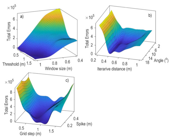 Filter performance sensitivity in terms of total errors to: (a) window size and threshold for the morphological filter (MF), (b) iterative distance and angle for the progressive triangulated irregular network densification (PTD), and (c) grid step and spikes for the triangulated irregular network densification (TIN). All filters were applied to the Plot 1 subscene of the agricultural site.