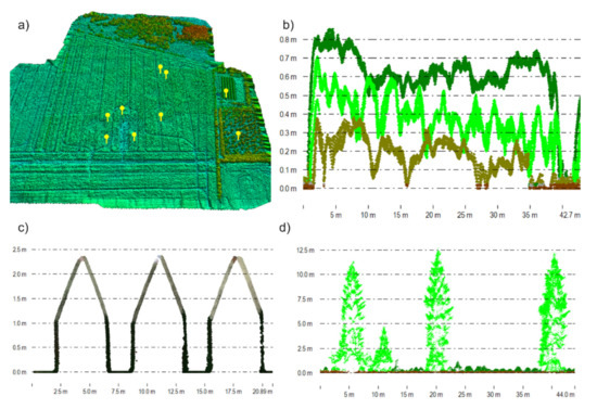 (a) Canopy height model (CHM) of the agricultural field indicating the locations of the experimental plots (yellow points), and profile view of point clouds normalized to the terrain illustrating the height of (b) vegetation in June (brown points), July (light green points), and August (dark green points), (c) a building, and (d) trees.