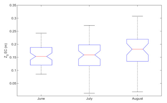 Anemometric-derived roughness length Z0_EC, corresponding to different turbulent source areas from: 25 to 27 June; 13 to 15 July; 12 to 13 August. The central mark indicates the median of Z0, while the bottom and top edges of the box indicate the 25th and 75th percentiles, respectively. The whiskers represent the most extreme data points.