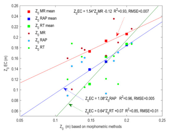 The observed positive correlation between the mean Z0 obtained by the EC method and the mean Z0_RT (i.e., the height of the plants) during the vegetation-growing period indicated that an accurate representation of vegetation height derived by a LiDAR system could be effective for estimating Z0 using the simple rule of thumb method (Figure 8). However, the correlations between Z0_RAP and Z0_MR with Z0_EC exhibited higher coefficients of determination (R2 = 0.96 and 0.93, respectively) and smaller RMSEs compared to Z0_RT. Thus, the investigation of a suitable morphometric method may be crucial to improving the accuracy of canopy aerodynamic characteristics estimations.