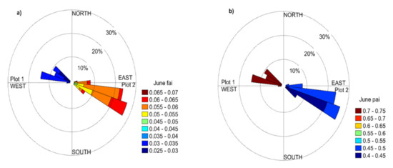 (a) Frontal area index (fai) and (b) planar area index (pai) in the form of wind rose for winds oriented from the west (Plot 1) and east (Plot 2) in June.