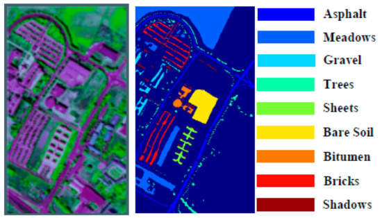 Figure 4. For the PaviaU dataset, each pixel has 103 spectral reflectance bands ranging from 430 to 860 nm, and the spatial resolution is 1.3 m. In these experiments, all bands are utilized for HSI classification.