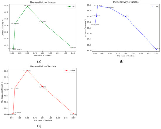 Figure 16 illustrates the performance of OA, AA and the Kappa coefficient κ as it varies with different