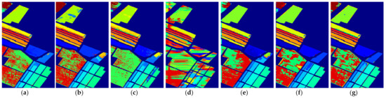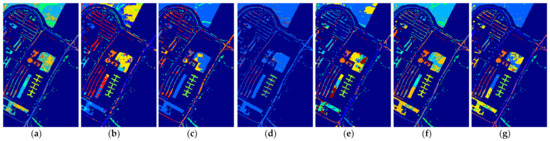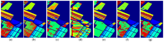 The classification maps of all methods with one sample on Salinas dataset. (a) SVM; (b) SS-LapSVM; (c) 3D-DENSEnet; (d) 3D-Gan; (e) SS-CNN; (f) 3D-CNN; (g) -means method, soft label with the proposed method. The experiments were conducted with five training samples per class on the Indian Pines and PaviaU dataset.