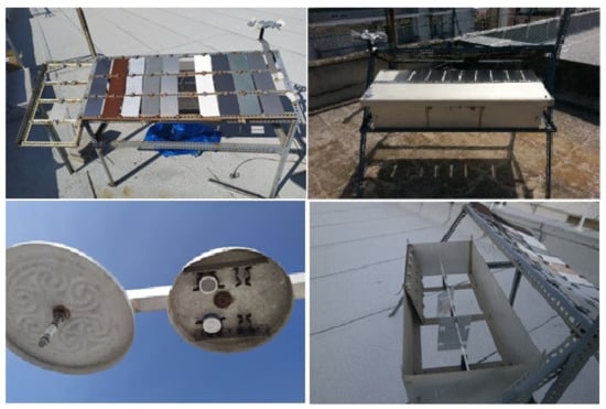 Views of the ACAS exposure site equipped with a metal rack on the roof of a building located in the Athens center, facing south. The rack consists of an inclined plane, for displaying samples of material under unsheltered conditions, and an aluminum box with an open bottom, for the exposure of materials’ specimens under sheltered conditions. In addition, there is a mast with an arm that holds two rain shields, in the form of discs, under which passive particle collectors and diffusive samplers for gaseous pollutants are exposed [,].
