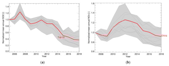 (a) Trends in SO2 emissions (normalized to the reference year 2005). The grey lines (within the grey area) represent the individual trends of the 10 provinces with the highest SO2 emissions. The red line shows the average of these 10 provinces. (b) Trends in NO2 emissions (normalized to the reference year 2007). The red line is based on the average for East China.