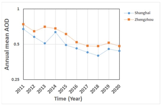 In this paper, the MODIS/Terra and MODIS/Aqua AOD product MCD19A2, retrieved with the multiangle implementation of atmospheric correction (MAIAC) algorithm [,] was used to produce a MODIS AOD time series from 2011 to the end of 2020. The MAIAC MCD19A2 AOD product was used instead of the C6.1 DBDT product used by Sogacheva et al., [,] because of its better performance over China [].