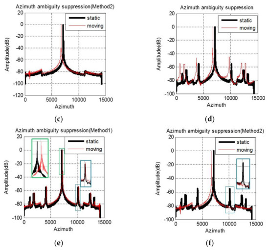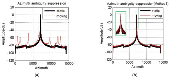 Compared with Equations (5) and (18), the core idea of Method 2 is to make the multi-channel echo equivalent to the traditional single-channel echo by compensating the motion phase. The azimuth ambiguity is suppressed, while the position deviation caused by radial motion still exists.