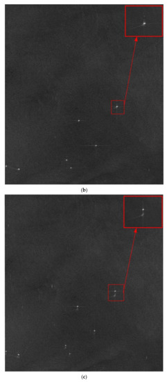 From Figure 5b, method 1 can suppress the false targets and improve the image quality significantly. Besides, it can also realize the relocation of the moving ships after motion phase compensation. The red box shows that the ship coincides with its wake. And Figure 5c illustrated that Method 2 also achieved the effect of false target suppression, but the positions of ships remain unchanged.