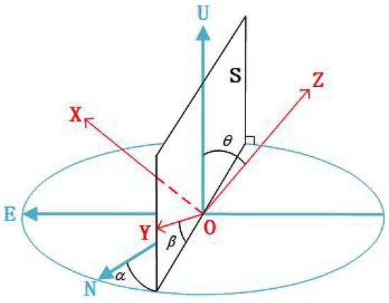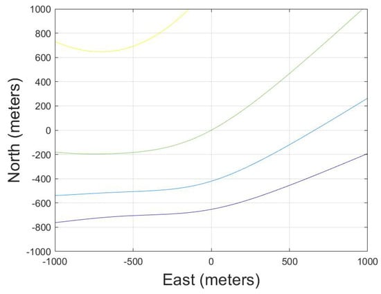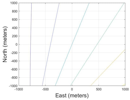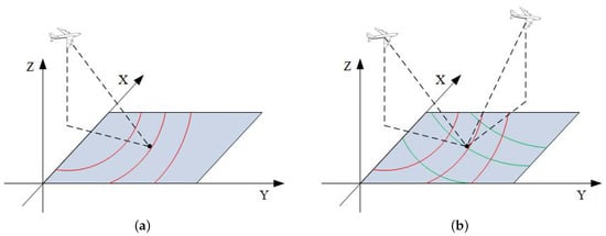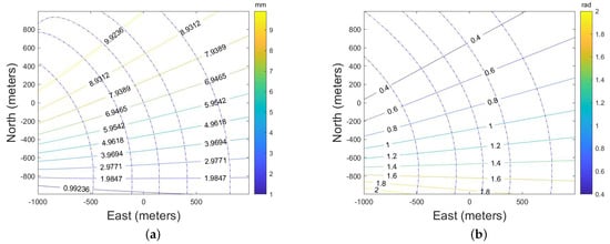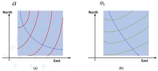 - First, the approximate UAV’s attitude information can be obtained through the INS, which is written as:Limited by the accuracy of the INS, the estimated value cannot be directly used for motion error compensation, but it can be used to obtain the approximate direction of the spatial variance of the high-frequency motion error parameters. Based on the system configuration, and can be calculated. Then, combining them with (7), the approximate a and of each position can be calculated. The diagram is shown in Figure 5. The red line in Figure 5a is the contour of a and the green line in Figure 5b is the contour of . The contour line will change with the system configuration and error parameters.