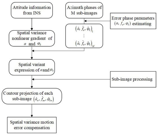 - Fifth, divide the whole image into subimages with the premise that the greatest difference in phase error is less than . Then, project the center of each subimage onto the nonlinear spatial variant gradient. The high-frequency error parameter of each subimage is same as the projection point on the spatial variant gradient. In Figure 6, is the center of one of the subimages that needs to be compensated for, and the error parameters can be obtained through .