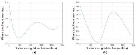- Fourth, based on M sets of estimation results, a and can be obtained at each point on the gradient. Here, the second-order fit is selected, which can be expressed as:where is the distance from to the origin point O of the amplitude gradient is the distance from to the origin point O of the initial phase gradient. is shown as the red line in Figure 6 as an example. The coefficients can be calculated as:Now, a and at each point on the nonlinear gradient are obtained.