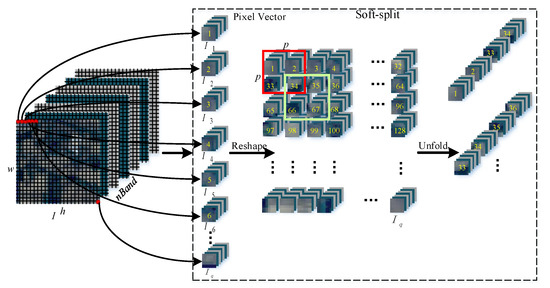 Next, a patch can be formed by combining different pixel vectors. In Figure 3, four pixel vectors (i.e., 1, 2, 33, and 34) in the input HSI sample are concatenated to form a new patch with size. By applying the soft split, can be calculated as follows: