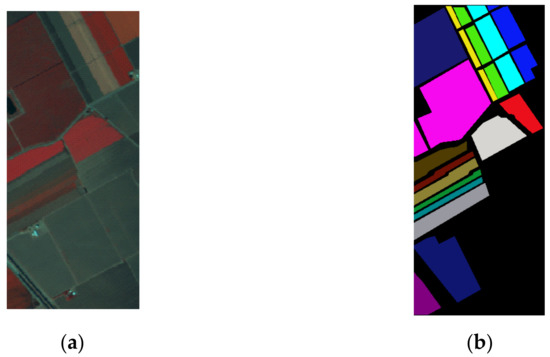 The Indian Pines dataset was acquired by the AVIRIS sensor in 1992. This dataset is 145 × 145 pixels with 103 bands ranging from 0.2–2.4 μm. The water absorption and low signal-to-noise ratio bands (bands 104–108, 150–163, and 220) lead to 200 bands. The ground truth contains 16 land cover types. Figure 6 displays the false-color composite image and the ground truth map. The detailed number of available pixels in each class is reported in Table 3.