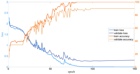 For each dataset, firstly, the input HSI is normalized into [−0.5, 0.5]. Then, the neighbors of each pixel to be classified are set to 3232 as the input of the well-designed model. Since the number of samples are different, the batch size for all the datasets is various. For the Salinas dataset, the bath size is set to 256; for the Pavia dataset, the batch size is set to 128; and for the Indian Pines dataset, the batch size is set to 100. Besides, for the proposed Modified-MLP, the numbers of training epochs are 500, 150, and 900 for the Salinas, Pavia, and Indian Pines datasets, respectively. The number of training epochs is determined by observing the curve of the loss function on the validated samples. To clearly display the training process, take the Modified-MLP as an example. The curves of the proposed Modified-MLP including the loss and accuracy of the training and test for all the datasets are shown in Figure 7, Figure 8 and Figure 9. Thus, the number of epochs is set to 500, 150, and 900 for the Salinas, Pavia, and Indian Pines datasets, respectively, when the learning curve is stable. In addition, for the proposed Multiscale-MLP, Soft-MLP and Soft-MLP-L epochs are both set to 300, 300, and 200 for the Salinas, Pavia, and Indian Pines datasets, respectively. In order to update the training parameters rapidly, the Adam optimizer [47] and decay learning rate are utilized; specifically, initial learning rates are set to 1, 8, and 2 for the Salinas, Pavia, and Indian Pines, respectively. The decay rate every 300 epochs is set to 1/3 for the proposed Modified-MLP. For the Soft-MLP, the learning rate is 8, 8, and 6 for the Salinas, Pavia, and Indian Pines datasets, respectively. To measure the performance of all the methods, overall accuracy (OA), average accuracy (AA), and kappa coefficient (K) are used as the evaluation indexes.