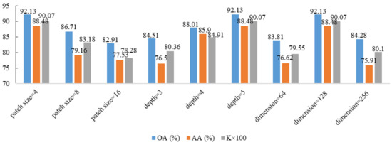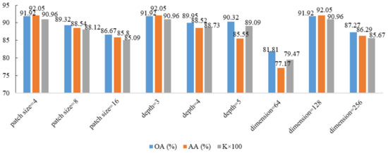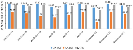The performance of the proposed Modified-MLP of different parameters with 200 training samples is shown in Figure 10, Figure 11 and Figure 12 for the Salinas, Pavia, and Indian Pines datasets, respectively. In the experiments, we use the control variable method for all the datasets. For the case of the model depth, the value of patch size and dimension of the model are fixed, set to 4 and 128, respectively. For the case of patch size, the value of model depth and dimension of the model are also fixed, set to 3 and 128, respectively. Similarly, for the case of dimension of the model, the value of patch size and model depth are fixed, set to 4 and 3, respectively. As shown in Figure 10, Figure 11 and Figure 12, it can be easily seen that for the Salinas and Pavia datasets, with increasing the value of patch size, the accuracies are decreased. In terms of the depth of the proposed Modified-MLP, for the Pavia and Indian Pines datasets, when the value of depth is larger, there are bigger improvements. For the Salinas dataset, when the value of depth is three, Modified-MLP achieves the best classification accuracy. Because there are more bands in the Salinas dataset compared to other datasets, increasing the depth results in more parameters in the MLP, which makes it easier to generate the overfitting problem. In addition, by scaling the width of the hidden layer in the proposed Modified-MLP, Modified-MLP with 128 dimensions reaches the highest OA, AA, and . These results suggest that the proposed Modified-MLP with five layers, dimension = 128, and a patch size of 4 for the Pavia and Indian Pines datasets obtain the highest accuracies, and with three layers, dimension = 128, and a patch size of 4 for the Salinas dataset achieves the best performance.