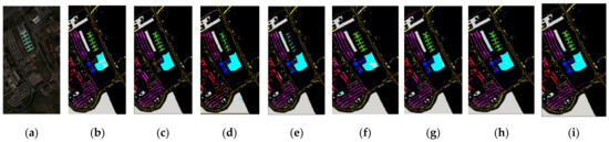 Pavia. (a) False-color composite image. The classification maps using (b) EMP-SVM; (c) CNN; (d) SSRN; (e) VGG; (f) Modified-MLP; (g) Multiscale-MLP; (h) Soft-MLP; (i) Soft-MLP-L.