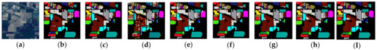 Indian Pines. (a) False-color composite image. The classification maps using (b) EMP-SVM; (c) CNN; (d) SSRN; (e) VGG; (f) Modified-MLP; (g) Multiscale-MLP; (h) Soft-MLP; (I) Soft-MLP-L.
