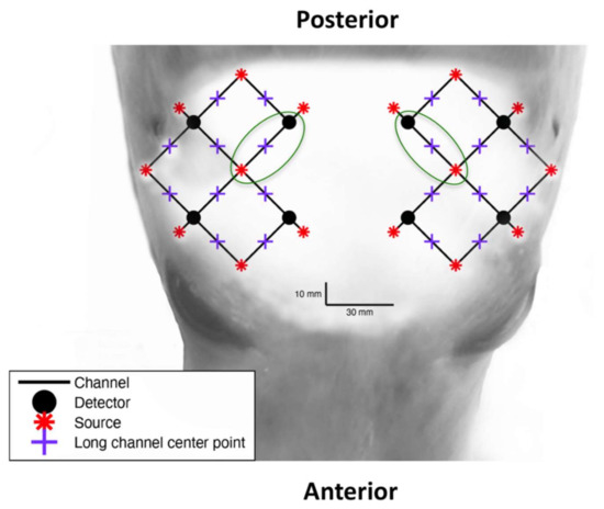 Drugging times were incorporated into Oxysoft and measurements of [ΔO2Hb] and [ΔHHb] (μ mol L−1) were extracted to Microsoft Excel (Version 16.43, Microsoft Corporation, Redmond, WA, USA) to construct data tables for modelling. For each ketamine and midazolam administration, 5 min pre-administration to 5 min post-administration of [ΔO2Hb] and [ΔHHb] measurements were extracted for one long channel in the left hemisphere of the brain and one long channel in the right hemisphere (Figure 1). The channels shown in Figure 1 were chosen as they represented the shallowest skin-cortical tissue paths. Given that the onset of action for both ketamine and midazolam occurs within 1 min of intravenous administration [13,15,35], the 10 min time frame was extracted to provide a buffer period within which physiological changes would be captured. For the purpose of this study, short channels receiving NIRS signals from superficial layers were not subtracted from long channels because we were analysing systemic level changes. Therefore, it was not necessary to eliminate systemic interference of the superficial layers, especially given that the magnitude of systemic changes is not significantly affected by contamination from extracerebral signals.