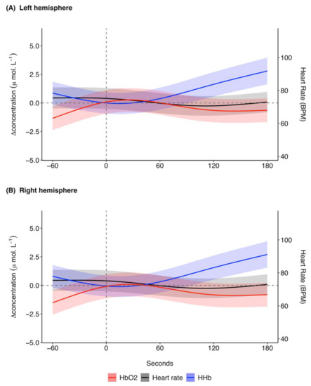 GAMM model prediction outcomes for [ΔHHb] (μ mol L−1), [ΔO2Hb] (μ mol L−1), and heart rate (BPM) in the (A) left hemisphere and (B) right hemisphere for 60 s before and 180 s after midazolam administration at time 0 s for 11 trials across four grey seals. For illustrative purposes a baseline shift was completed so that all concentrations are expressed as relative changes from a baseline (0 μ mol L−1) between the left and right hemispheres at time of drug administration. Changes in heart rate are systemic, meaning the presented model prediction outcomes for heart rate are the same for the left and right hemispheres. The shaded regions represent the 95% confidence intervals. GAMM, generalised additive mixed model; [ΔHHb], change in concentration of deoxygenated haemoglobin; [ΔO2Hb], change in concentration of oxygenated haemoglobin.