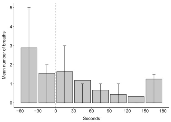 The mean number of breaths in 30 s intervals for 60 s before and 180 s after midazolam administration at time 0 s for 11 trials across four grey seals. Error bars represent the upper (75th percentile) and lower (25th percentile) quartile range of the data.