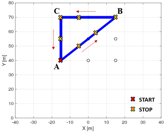 A Cartesian reference system and a square grid identical to Figure 5 was replicated on the ground, and its points were used for the calibration of the AoA measurements. The position of the two nodes, as well as the nominal target path, are sketched out in Figure 10. The AP was placed at the midpoint of the baseline between the two nodes, namely point (11.4 m, 5.25 m).