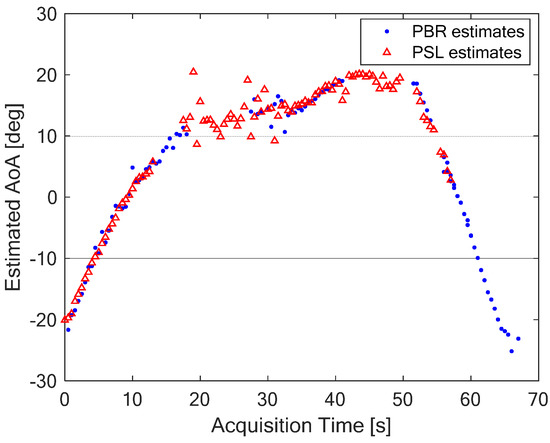 The complementarity of the PBR and PSL is evident in Figure 11, where the AoA measurements for the two sensors are compared. In fact, the AoA estimates of the PSL sensor (red triangles) compensate for the lack of measurements of the PBR sensor (blue dots) when the target is stationary (from 18 s to 27 s and from 40 s to 50 s). On the other hand, the PBR guarantees a continuity of the high-rate measurements when the target is moving and the person interrupts the transmission of the video or the communication is over (producing a scarcity of PSL measurements).