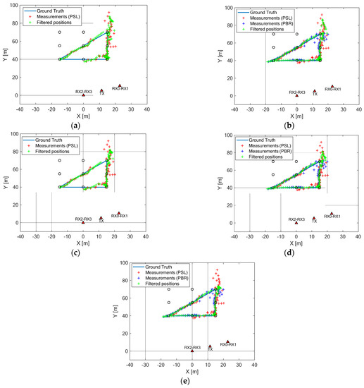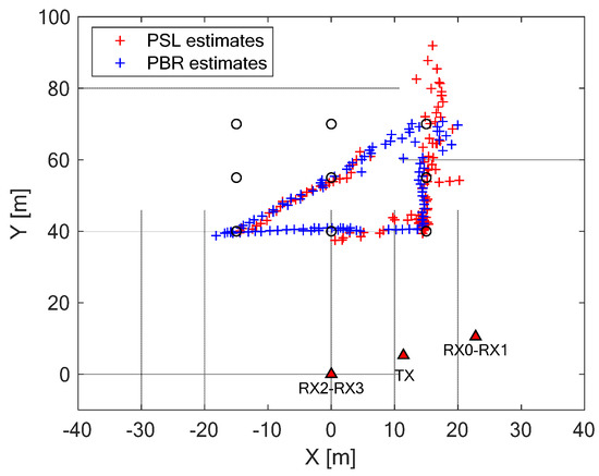 Figure 12 shows the conversion of the individual PSL (red crosses) and PBR (blue crosses) measurements on the x-y plane. In this figure, it is evident that both the PSL and PBR are effective for short-range human target localizations. However, each one of the sensors presents gaps in the measurement continuity in some portions of the path. Moreover, there are points (for example, for y > 60 m) where the position estimates are less accurate, especially for the PSL, providing estimates that vary around the actual position. The error in these estimates could be probably increased by the proximity of a building (as can be seen in Figure 10) and, in particular, of a metallic fence present on the right side of the reference square grid and by the greater distance between the target and receiver. This consideration matches with the results shown in references [6,9].